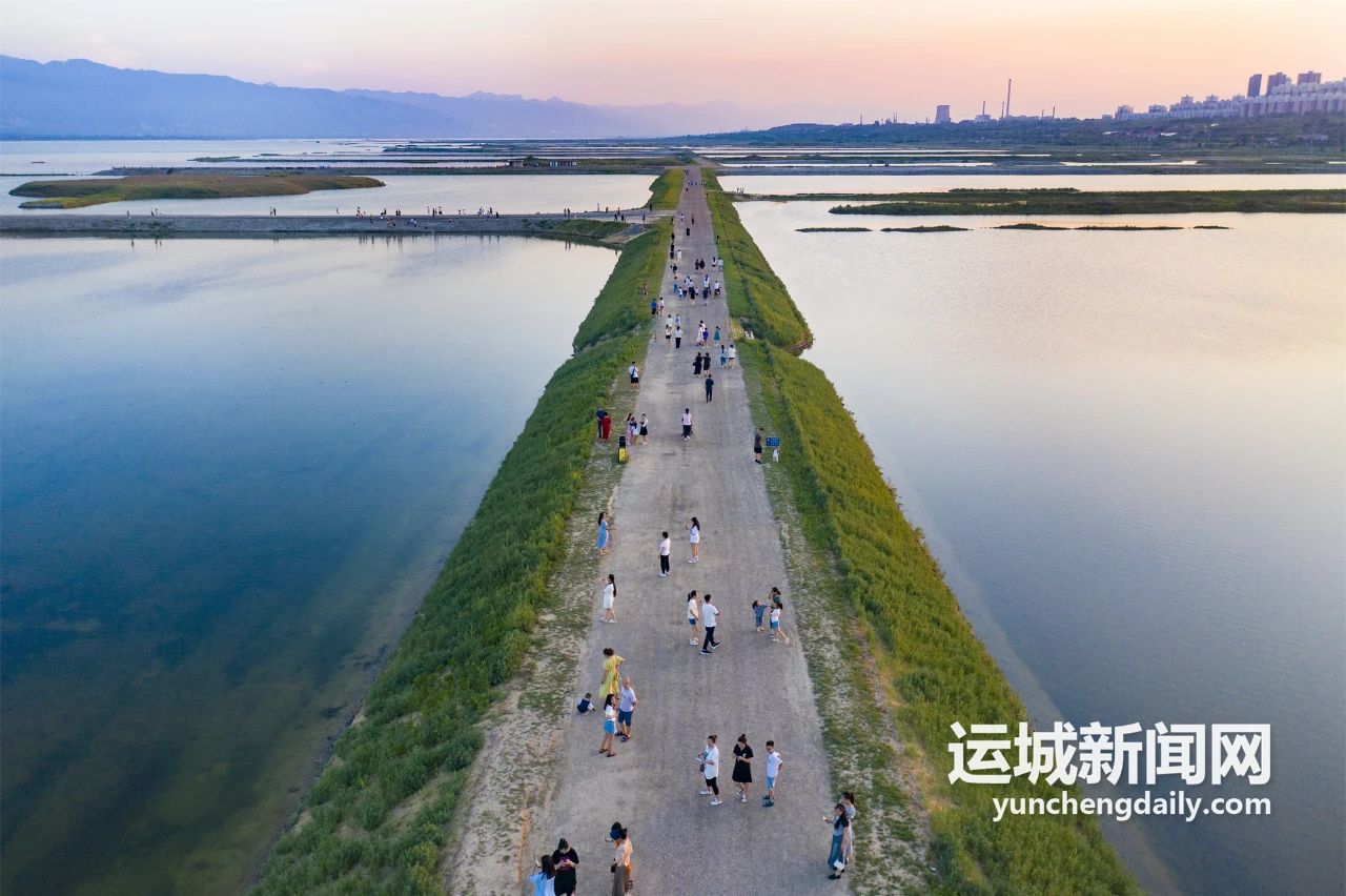 清晨6點(diǎn),中條山下涼風(fēng)習(xí)習(xí),靜謐清麗。但圍繞鹽湖岸畔的步道上,穿著清涼晨跑的,扯著嗓子練聲的,舉著相機(jī)拍照的,人來(lái)人往,生命涌動(dòng)的力量激蕩著黎明的寧?kù)o。待清晨的第一縷陽(yáng)光瀉向湖面,自帶柔光濾鏡,碧波浩渺,遠(yuǎn)山蒼茫,美得不可方物。